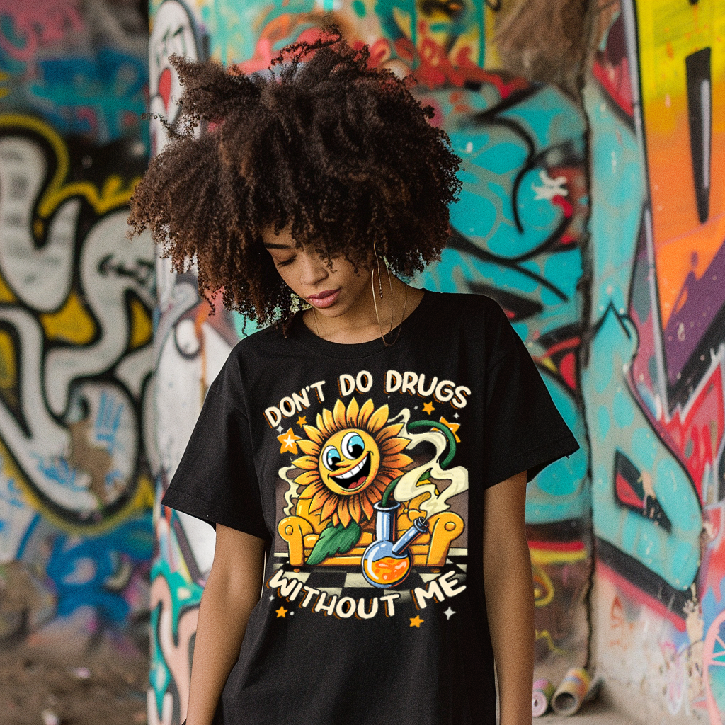 Brighten up your wardrobe with a cheeky twist using our "Don't Do Drugs Without Me" Sunflower Tee! This playful design showcases a joyful sunflower lounging with a bong, set against a whimsical checkerboard background. It's the perfect blend of lighthearted fun and bold statement, ideal for those who like their clothing with a bit of personality.